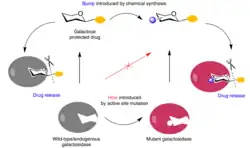 Schematic of bumped pro-drug and hole-modified enzyme, releasing the drug only in the presence of the bump-and-hole pair.[19]