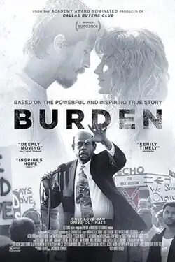 Burden is a 2018 American drama film, inspired by true events. The film was produced by Robbie Brenner and Bill Kenwright, and was written and directed by Andrew Heckler.[4] The film stars Garrett Hedlund, Forest Whitaker, Andrea Riseborough, Tom Wilkinson, Tess Harper, and Usher.[5] The film premiered at the 2018 Sundance Film Festival and won the U.S. Dramatic Audience Award.[6]