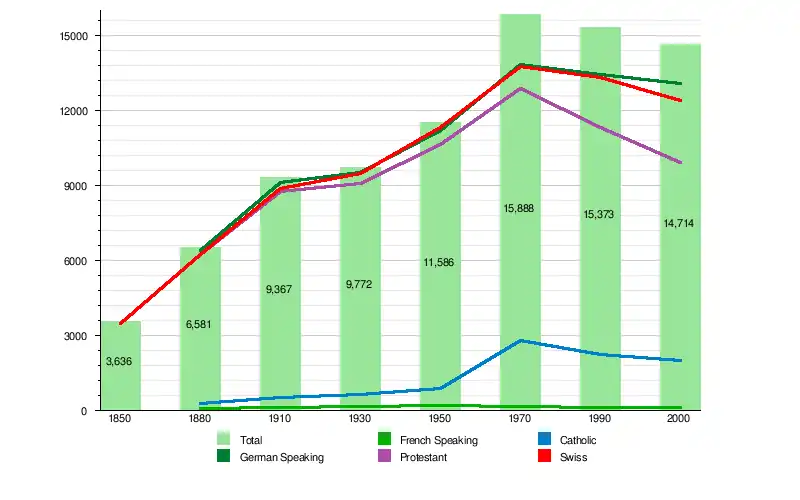 From the 2000 census, 1,993 or 13.5% were Roman Catholic, while 9,275 or 63.0% belonged to the Swiss Reformed Church. Of the rest of the population, there were 211 members of an Orthodox church (or about 1.43% of the population), there were 14 individuals (or about 0.10% of the population) who belonged to the Christian Catholic Church, and there were 1,337 individuals (or about 9.09% of the population) who belonged to another Christian church. There were 3 individuals (or about 0.02% of the population) who were Jewish, and 865 (or about 5.88% of the population) who were Islamic. There were 39 individuals who were Buddhist, 224 individuals who were Hindu and 13 individuals who belonged to another church. 986 (or about 6.70% of the population) belonged to no church, are agnostic or atheist, and 413 individuals (or about 2.81% of the population) did not answer the question.[12]