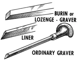 A burin (/ˈbjʊərɪn, ˈbɜːrɪn/ BUR(E)-in) is a steel cutting tool used in engraving, from the French burin (cold chisel). Its older English name and synonym is graver.[3]