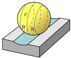 The action of a hardened ball against a softer, flat plate illustrates the process of burnishing. If the ball is pushed directly into the plate, stresses develop in both objects around the area where they contact. As this normal force increases, both the ball and the plate's surfaces deform.