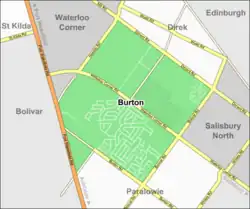 Burton is a small residential suburb approximately 21 kilometres north of the CBD of Adelaide, South Australia. It is located five km north-west of Salisbury in the flat terrain of the Adelaide Plains. The suburb contains two wetland reserves, including Kaurna Park.