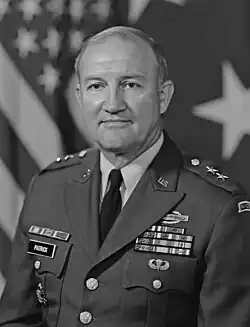 After serving as chief of the Legislative Liaison Office of the Secretary of the Army in Washington, D.C., Patrick returned to Fort Campbell to begin his tenure as the 32nd commanding general of the 101st Airborne Division on June 18, 1985, replacing outgoing Major General James E. Thompson Jr.[3] Patrick held command on December 12, 1985 when 248 soldiers of the 101st Division and 8 air crew members died in a plane crash at Gander, Newfoundland, International Airport, one of the worst accidents in aviation.[5] Serving at Fort Campbell until May 20, 1987, Patrick moved to South Korea to become commanding general of the Combined Field Army between the United States and South Korea. He was also nominated for promotion to lieutenant general.[6]