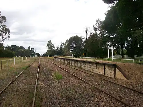 The station is located on a crossing loop. The original station building was demolished after burning down. The current platform was built for by the NSW Rail Museum (RTM) for their tourist service in the 1990s.