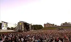 Flea decided that he would finish the album and then quit the band. He was still upset over disputes with Frusciante, who he thought was trying to take over the band.[56] According to Smith, Flea and Frusciante eventually had a sit-down meeting with each other to air out their differences. Frusciante had no idea how Flea was feeling and had no intentions of taking over.[56] Flea also credited practicing Vipassanā meditation along with Frusciante for helping the two repair their musical relationship.[17] With their problems worked out, the band launched their promo tour to support the album on New York City's Ellis Island.[29] Sponsored by the rock radio station K-Rock, the event was titled the "Pep Rally".[29] The band performed eight songs from By the Way, as well as tracks from Californication and Blood Sugar Sex Magik in front of 900 contest winners.[29] The New York Post declared the show "one of the top concerts of the year."[29] The location was chosen in order to reinvigorate lower Manhattan after the September 11 attacks and all proceeds were donated to pertinent charity organizations.[29] Immediately following this, the Red Hot Chili Peppers embarked on a world tour to support the album. Beginning in Europe, they also played at events such as the Fuji Rock Festival and Coachella Valley Music and Arts Festival in between. The band eventually culminated their Europe leg of the tour in February 2003, and commenced the United States leg on May 1.[57] The Red Hot Chili Peppers played at Madison Square Garden in New York City on May 20, 2003, to a sold-out crowd and an enthusiastic response from critics. Kelefa Sanneh of The New York Times reported that "on Tuesday night, the [Red Hot Chili Peppers] came to Madison Square Garden for an extraordinary two-hour performance ... On 'Don't Forget Me', [Flea] strummed chords, while Mr. Frusciante contributed a gorgeous guitar line that bubbled and hissed like some sort of chemical reaction."[58] The US leg ended on June 21; the band took a small hiatus before performing at Slane Castle in Ireland on August 23, to a crowd of over 80,000.[59] Live at Slane Castle, the result of the concert, would become the Chili Peppers' second live DVD, after Off the Map.