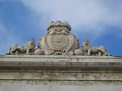 Detail: coat of arms flanked by lions.