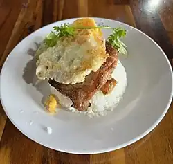 Cơm tấm (Vietnamese: [kəːm tə̌m]) is a Vietnamese dish made from rice with fractured rice grains. Tấm refers to the broken rice grains, while cơm refers to cooked rice.[1][2] Although there are varied names like cơm tấm Sài Gòn (Saigon broken rice), particularly for Saigon,[1] the main ingredients remain the same for most cases.