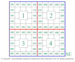 10-degree c-squares are specified as being identical to equivalent World Meteteorological Organization (WMO) square codes, refer illustration at right. These squares are aligned with 10-degree subdivisions of the global latitude–longitude grid, which for c-squares use is specified as employing the WGS84 datum. WMO (10 degree) squares are encoded with four digits, in the series 1xxx, 3xxx, 5xxx and 7xxx.[12] The leading digit indicates the "global quadrant" with 1 for north-east (latitude and longitude are both positive), 3 for south-east (latitude is negative and longitude positive), 5 for south-west (latitude and longitude are both negative) and 7 for north-west (latitude is positive and longitude negative). The next digit, 0 through 8, corresponds to the tens of latitude degrees either north or south; while the remaining 2 digits, 00 through 17, correspond to the tens of longitude degrees either east or west (by specification, 0 is treated as positive). Thus the 10 degree cell with its lower left corner at 0,0 (latitude,longitude) is encoded 1000, and acts as a bin to contain all spatial data between 0 and 10 degrees north (actually, 0 and 9.999...) and 0 and 9.999... degrees east; the 10 degree cell with its lower left corner at 80 N, 170 E is encoded 1817, and acts as a bin to contain all spatial data between 80 and 90 degrees north and 170 and 179.999... degrees east.