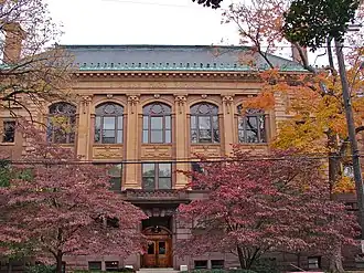 He was born on February 26, 1863, to Barbara Hebble and Amos S. Urban in Conestoga Township, Lancaster County, Pennsylvania. He graduated from Lancaster’s Boys High School in 1880, and then apprenticed as a draftsman at the E. L. Walter architectural firm in Scranton, Pennsylvania. Emlen also worked in the office of Willis G. Hale in Philadelphia. He returned to Lancaster in 1886. He designed many of Lancaster’s notable buildings including the Farmer's Southern Market on Queen Street in 1888, the Watt & Shand Department Store in 1898, and the Y.M.C.A., Harold's Building, Unitarian Church, and St. James Episcopal Church parish House on Duke Street in 1903.[1] His designs embraced architectural styles as diverse as Queen Anne, Beaux-Arts, and Colonial Revival. His work forms a bridge between the Victorian Era and the Modern Age.[2]