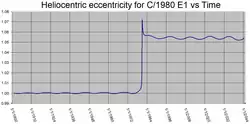 C/1980 E1 is a non-periodic comet discovered by Edward L. G. Bowell on 11 February 1980 and which came closest to the Sun (perihelion) in March 1982. It is leaving the Solar System on a hyperbolic trajectory due to a close approach to Jupiter. In the 43 years since its discovery only 3 objects with higher eccentricities have been identified, 1I/ʻOumuamua (1.2), 2I/Borisov (3.35), and 3I/ATLAS (6.15).[3][4]