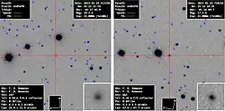 The object was subsequently detected in older images taken by the Zwicky Transient Facility (ZTF) in Palomar Observatory on 22 December 2022, when it had a magnitude of 19.2–19.6. These deeper and better resolved images also revealed it had a very condensed coma and a small straight tail 10 arcseconds in length, indicating it was a comet already active at a distance of 7.9 AU (1.18 billion km) from the Sun.[1][11] More evidence of cometary activity was later reported by Hidetaka Sato, M. Mattiazzo and Cristóvão Jacques.[10]