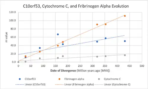 C10orf53 is predicted to have a slower evolution compared to the gene, fibrinogen alpha, but it also has a quicker evolution compared to cytochrome c. Fibrinogen alpha is considered as a gene that had evolved rather quickly when examining the gene in different organisms. When two organisms diverged into different taxa, the gene went through alterations that made it significantly different from other organisms, causing it to have a quick rate of evolution. In contrast, Cytochrome C is relatively conserved throughout different organisms, which shows that it has a slow rate of evolution. C10orf53 has a rate of evolution that is smaller than fibrinogen alpha, but larger than cytochrome c.