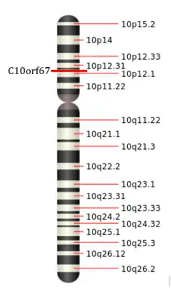 The gene spans 142,366 base pairs and is located at the 10p12.2 locus on the minus (-) or sense strand of chromosome 10. It is flanked upstream by the gene ARMC3[8] and downstream by the gene KIAA1217.[9][10] These genes are approximately 150,000 bp and 350,000 bp from C10orf67, respectively.
