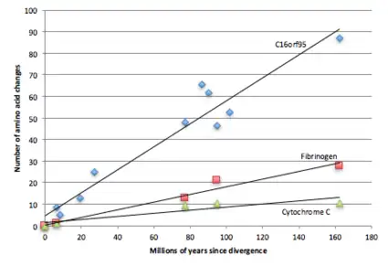 C16orf95 has a large number of amino acid changes over time, indicating it is a quickly evolving protein.