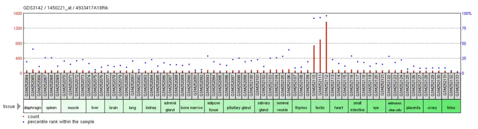 C6orf201 is primarily expressed in the testis of humans and is also expressed in the testis of adult mice and rats.[6] GEO microarray data also supports expression of C6orf201 in the testis of humans and mouse.[21][22]