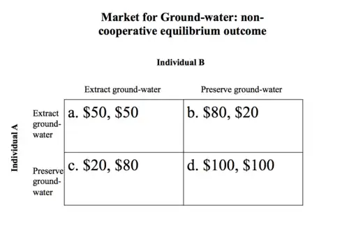 This can be seen in a pay-off matrix. Where there are two individuals making separate choices to defect by privatizing benefits and commonizing costs, or to cooperate and refrain from personal gain in order to preserve a resource. If Individual A decides to preserve water while Individual B does not then Individual A will only receive $20 while Individual B gains $80. This is true vice versa if Individual B decides to preserve water and Individual A decides to extract. Both individuals have an incentive to defect and extract water to gain $50, so as rational consumers they will extract water.[4] However, if neither party extracted water then they would actually gain $50 more in profit.[4] This is a case of the Prisoner's Dilemma.[5] However, unlike the Prisoner's Dilemma that only has two people, CC–PP Game is an aggregate of many individuals, making it harder to see the effects of a single person's decisions.[5]
