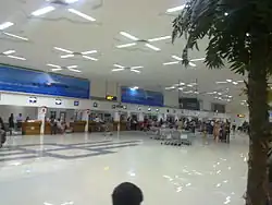 Work on the third phase was intended to accommodate 5 million passenger movements annually and was started in 2007.[21] The third phase involved the commissioning of a central block, connecting the domestic and international terminals and enlarging the airside area to accommodate more gates and waiting areas along with increased shopping areas. This increased the built-up area by another 29,700 m2 (320,000 sq ft).[22] The airside area of the international arrivals and departures blocks were integrated and glass walls were installed to allow for more natural light. The runway was re-surfaced in 2008.[23] The number of parking areas was increased from 15 to 24, including three dedicated for cargo airlines. The third phase also completed the expansion of the cargo village and a second aircraft taxiway to the MRO facility.[24][25]