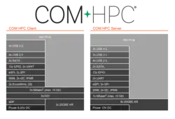 COM-HPC is a computer-on-module form factor standard that targets high performance compute and high I/O levels. Each COM-HPC module integrates core CPU and memory functionality and input and output including USB up to Gen 4, audio (MIPI SoundWire, I2S and DMIC), graphics, (PCI Express) up to Gen. 5, and Ethernet up to 25 Gbit/s per lane. All I/O signals are mapped to two high density, high speed and low profile connectors on the bottom side of the module. COM-HPC employs a mezzanine-based approach. The COM modules plug into a carrier or base board that is typically customized to the application. Over time, the COM-HPC mezzanine modules can be upgraded to newer, backwards-compatible versions. COM-HPC targets Industrial, Military/Aerospace, Gaming, Medical, Transportation, IoT, and General Computing embedded applications and even scales up to RAM and performance hungry server or edge server applications.