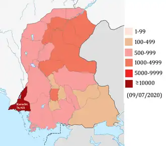 The next day, Pakistan reported nine new cases in Karachi, meaning that there was a total of 16 cases of COVID-19, with Sindh having the highest number of cases, 13 altogether.[31] Five of the new patients had travelled to Syria and some others patients had returned from London. Three new cases were confirmed on 10 March, including one in Hyderabad and the first case in Quetta, Balochistan.[32][33]
