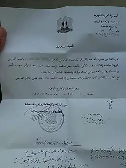 On 12 January 2020, the World Health Organization (WHO) confirmed that a novel coronavirus was the cause of a respiratory illness in a cluster of people in Wuhan City, Hubei Province, China, which was reported to the WHO on 31 December 2019.[7][8] Many people in Syria did not have confidence in the government's transparency during the pandemic, accusing it of hiding the true numbers of cases and deaths,[9][10][11][12] especially in Damascus, Rif Dimashq, and Aleppo.[13][14][15] It has been speculated that doctors in hospitals and medical facilities were being threatened with being fired or even being arrested and detained by the government forces if they said anything about the truth of what was happening in the hospitals.[16][17] It has also been rumoured that the Syrian state has even gone so far as to suggest terminating the lives of suspected COVID-19 patients.[18] This led people who are experiencing some symptoms or even being sure about being infected to not telling the government nor seeking governmental or even private medical care, and quarantining themselves at home out of fear if possible.[19] Analysts reasoning with these claims highlight the example of misinformation about the government's numbers is the number of cases registered in neighboring countries of people arriving from Syria, and sometimes that number in one day was greater than those reported by the Syrian government during a certain period of time.[20][21]