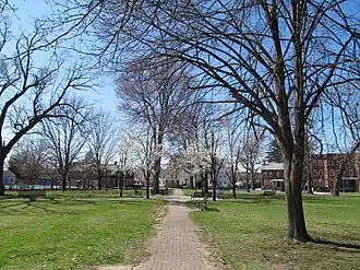 The Cabotville Common Historic District is a predominantly residential historic district in Chicopee, Massachusetts. It is centered on the park now called Lucy Wisniowski Park, which was previously known as "The Common", and includes all of the buildings that face the park, as well as a few on immediately adjacent city streets. It was developed in the 1830s and 1840s as an area where mid-level employees of Chicopee's mills and factories lived, between the simpler tenements and boarding houses of the lower classes, and the elite mansions of the proprietors and top-level managers. Most of the building stock in the district was built between 1846 and 1870, and were single family brick or wood-frame Greek Revival houses. The Common, whose original purpose was to provide shared pasturage for area residents, was by the end of this period converted to a park. From the 1870s to the 1890s the housing stock was predominantly multi-family in scale, and exhibited the architectural fashions of the time: Italianate, Second Empire, and Victorian. Thereafter development was limited due to a lack of available land, and only a few brick apartment houses were built between 1890 and 1915.[2]