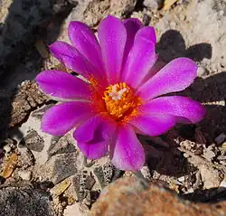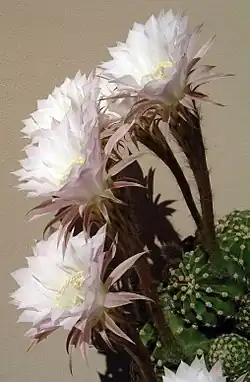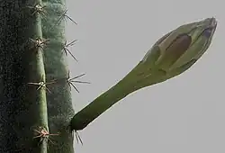 Like their spines, cactus flowers are variable. Typically, the ovary is surrounded by material derived from stem or receptacle tissue, forming a structure called a pericarpel. Tissue derived from the petals and sepals continues the pericarpel, forming a composite tube—the whole may be called a floral tube, although strictly speaking only the part furthest from the base is floral in origin. The outside of the tubular structure often has areoles that produce wool and spines. Typically, the tube also has small scale-like bracts, which gradually change into sepal-like and then petal-like structures, so the sepals and petals cannot be clearly differentiated (and hence are often called "tepals").[11] Some cacti produce floral tubes without wool or spines (e.g. Gymnocalycium)[17] or completely devoid of any external structures (e.g. Mammillaria).[11] Unlike the flowers of most other cacti, Pereskia flowers may be borne in clusters.[12]