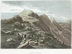 In his Dictionarum Duplex published in 1632, John Davies of Mallwyd differentiated between the two words cadair ('chair') and cader ('fort, fortress'), referring to Cader Idris and Cader Ddinmael. That interpretation was followed by some later lexicographers, including Thomas Charles[9] and Titus Lewis.[10] It is now accepted, however, that cader is a spelling of a spoken form of cadair, and that there is no evidence that cadair and cader are separate words.[11] But as it represents the pronunciation in the local dialect, the spelling Cader Idris is often seen in Welsh and English, and in June 2016 Snowdonia National Park decided to adopt that spelling on its signage, despite advice from the Welsh Language Commissioner and from Park officers, who favoured Cadair.[12] The local dialect form is also seen in the name of the local secondary school, Ysgol y Gader. The name of the mountain is typically spelt 'Cadair Idris on current maps. The summit of the mountain is known as Penygader ('top of the chair/stronghold').