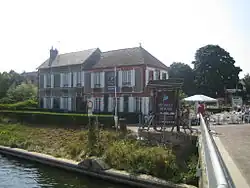 The two-story red brick building was built at the end of the 19th century.[1] The nearby Bénouville Bridge was a key objective of the British 6th Airborne Division. A unit of Glider infantry of the division's 2nd Battalion was to land, take the bridge intact and hold it until relieved. The unit was led by Major John Howard. Howard and his men boarded three gliders. Released at 8,000 feet in the pitch black of a storm filled night, all three gliders managed to make a rough landing in a field almost directly on top of their objective.[2] Leaving the broken gliders, the men engaged in a short, fierce firefight which ended with the British paratroopers in control of the bridge. The structure claims without certainty to be the first French house to be liberated, although in the book Commando du Pont Pegase, French historian Norbert Hugedé writes that the house owned by Mr Picot was liberated earlier.[3] Detailed accounts of other historians, such as British 6th Airborne Division specialist Neil Barber (in his book The Pegasus And Orne Bridges[4]) and French Battle of Normandy specialist Marc Laurenceau (in his book Historial du Jour J et de la bataille de Normandie[5]), confirm that this house was not liberated at the start of the fighting, unlike other buildings such as the Picot cafe or the former tramway station (the latter no longer in existence).[6]