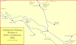The routes from Glasgow, from South Side via Cambuslang, and from Buchanan Street via Coatbridge, converged at Motherwell station, some distance to the south-east of the present-day station; the line continued east and then south to Carstairs and Carlisle. The original Wishaw and Coltness Railway had a branch line to Cleland, where there was an iron works (and a passenger station named Newarthill), and a line to Morningside, close to further iron works.