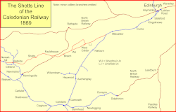 The Wishaw and Coltness Railway had long since opened its line, principally for mineral haulage, reaching as far east as Cleland by way of Holytown, and leased by the Caledonian Railway. In 1869 the line was extended from Cleland to a junction at Midcalder on the Carstairs - Edinburgh line; it ran via Hartwood, Fauldhouse, Addiewell and West Calder. The last two places were already established industrial centres, and shale extraction was a major activity; the industries were now brought in to the Caledonian network. The dominant traffic on the line was to be minerals, and numerous mines, shale pits and works were connected, from the start, or in the immediately succeeding years. A mineral line loop sweeping to the north of Addiewell and West Calder was provided, rejoining the line east of West Calder. The lines opened for goods and mineral trains on 1 January 1869.