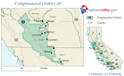 California's 20th congressional district is a congressional district in California including much of the southern and southeastern part of the state's Central Valley. The district is currently represented by Republican Vince Fong. Fong was elected in a special election on May 21, 2024, after Kevin McCarthy resigned from Congress following the motion to vacate that ousted him from the office of House Speaker.[3][4]