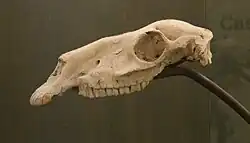 Calippus is an extinct genus of hoofed mammals in the horse family (Equidae), known from the Middle Miocene through the Early Pliocene of North and Central America. Fossils have been found in the Central United States and the Eastern United States, ranging south to Honduras.[1][2] These equines had high crowned teeth and a quadrangular, wide muzzle, and were small compared to their contemporary relatives,[3] with C. elachistus weighing 49 kg, C. cerasinus weighing 102 kg,[4] 132 kg for C. theristes and 73 kg for C. mccartyi.[5]