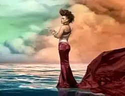 Jackson wearing a maroon-colored gown standing in an ocean while clouds can be shown in the background in the "Call on Me" music video. It is noted as one of the most expensive music videos ever made.