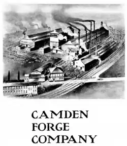 The Camden Forge Company (or Camden Forge for short) was an American steel forging company founded in 1901 and shut down during 1956,[1][2] supplying custom forgings for anything from rods and bolts to steers and axles. The company's original address was the corner of Mount Ephraim Avenue and Bulson Avenue in Camden, New Jersey. After a few years the official address was changed to Mount Ephraim Avenue and the Atlantic City Railroad.[3][4] During both World War I and World War II, they supplied materials for ships made by New York Shipbuilding Company.[5] In July 1942, the company received the award for the Army and Navy "E" pennant for excellency in the production of war materials. The pennant received had 5 stars.[6] Closing in 1956, the company went to public auction on April 10, 1956, at auction the company was worth $8,500,000.[7] Camden Forge's Commercial and Government Entity code is 10399.[8]
