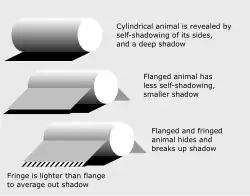 Camouflaged animals and vehicles are readily given away by their shapes and shadows. A flange helps to hide the shadow and a pale fringe breaks up and averages out any shadow that remains.