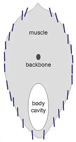 Some animals, such as the horned lizards of North America, have evolved elaborate measures to eliminate shadow. Their bodies are flattened, with the sides thinning to an edge; the animals habitually press their bodies to the ground; and their sides are fringed with white scales which effectively hide and disrupt any remaining areas of shadow there may be under the edge of the body.[69] The theory that the body shape of the horned lizards which live in open desert is adapted to minimise shadow is supported by the one species which lacks fringe scales, the roundtail horned lizard, which lives in rocky areas and resembles a rock. When this species is threatened, it makes itself look as much like a rock as possible by curving its back, emphasizing its three-dimensional shape.[69] Some species of butterflies, such as the speckled wood, Pararge aegeria, minimise their shadows when perched by closing the wings over their backs, aligning their bodies with the sun, and tilting to one side towards the sun, so that the shadow becomes a thin inconspicuous line rather than a broad patch.[70] Similarly, some ground-nesting birds, including the European nightjar, select a resting position facing the sun.[70] Eliminating shadow was identified as a principle of military camouflage during the Second World War.[71]