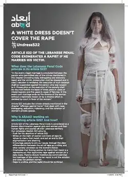 The Campaign against the Lebanese rape-marriage law Article 522, officially known as "A White Dress Doesn't Cover the Rape", was launched by the Lebanese non-governmental organization Abaad MENA in December 2016. Its aim was to abolish Article 522 of the Lebanese Penal Code, which allows a man to avoid punishment for rape if he produces a valid marriage contract with the victim.[1] The campaign included street protests, the hashtag #Undress522 in social media, and a video of a raped women covered in bruises turned into a bride.