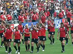 Going into the 2007 Rugby World Cup in France, Canada were ranked as severe outsiders, and given odds of 5000/1 to win the tournament.[36] Pool B also contained Australia, Fiji, Japan and Wales. In their opening match on 9 September the Canadians lost 42–17 to Wales.[37] They followed this with a 29–16 loss to Fiji, whom they had needed to beat to have realistic hopes of progressing to the quarterfinals.[38] They drew 12–12 with Japan, conceding an injury-time try by Koji Taira.[39] In their final game they lost 37–6 to an Australian side consisting mostly of second-string players.[40] Canada finished bottom of Pool B, and returned home from a World Cup without winning a single game for the first time ever.