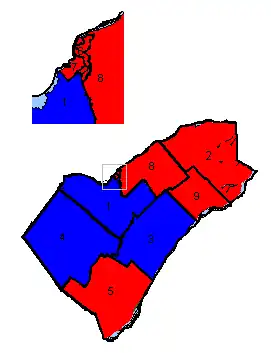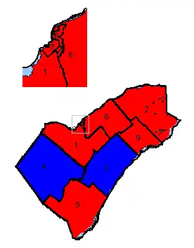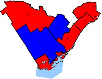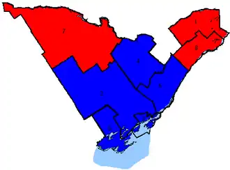 The 2019 election saw the Conservatives regain Hastings—Lennox and Addington, with the other seats remaining unchanged, resulting in the Conservatives winning five seats to the Liberals three.