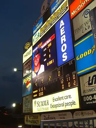 In January 2013, shortly after Ken Babby-led Fast Forward Sports Group acquired the team, the Aeros' announced a $1.65 million project to install a new scoreboard at 26 ft high and 68 ft wide, continuing to be one of the largest in Minor League Baseball. Additionally, a new smaller ribbon board display in left field was installed as well. Both displays were designed and built by Daktronics.[9][10]
