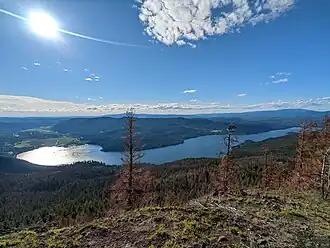 Canim Lake /ˈkænɪm/ is a lake in British Columbia, Canada. Its west end is 36 km (22.4 mi) northeast of 100 Mile House. "Canim" means a type of large canoe in the Chinook Jargon. Canim Lake is 26.5 km (16.5 mi) long. It is also part of the territory of the Shuswap First Nation where the ancestors are part of the Lake Division of the Shuswap nation of the Interior Nations of British Columbia. The Reilly Commission states that the 2,029 hectares region around Canim Lake are set aside for the Shuswap First Nation. In the summer of 1995, there was an archaeological evidence of an ancient civilization and evidence of carbon dated as 4,300 old.[1]