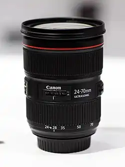 The Canon EF 24–70mm lens is a family of professional EF mount wide-to-normal zoom lenses manufactured and sold by Canon. The first of the family, the EF 24–70mm f/2.8L, was introduced in 2002 to replace the well-regarded 28–70mm f/2.8L. Two later versions were announced in 2012. The first of these, the EF 24–70mm f/2.8L II, was announced by Canon in February,[1][2][3] but would not ship to customers until September of that year.[4] This lens replaced the Mk I, and had an MSRP of US$2299 when introduced.[1] The latest member of the family is the EF 24–70mm f/4L IS USM, which became available in January 2013.[5] The f/4 version, which is the first of the family to include image stabilization, was initially reported to be the standard kit lens for the Canon EOS 6D,[6] but did not appear in 6D kits in most markets until late 2014, and 5D Mark IV kit in 2016.