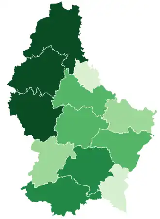 Unlike in Switzerland and similarly to France, Luxembourgish cantons have no administrative structure of their own—rather, they are used to delimitate electoral constituencies and judicial districts.[1] Until 2015, they also served to delimitate Luxembourg's three districts.