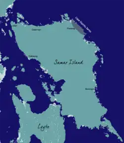 Cape Espiritu Santo, also known as Cape Espiritu Santo Mountains,[1] is the northeastern point of the Northern Samar and the northernmost point of Samar Island. It was named Cabo Espiritu Santo by early European explorers, since it was discovered on the Feast of the Holy Spirit.[2] It is also the first land sighted by the Spaniards when sailing from Nueva España, marks the end of their long sailing as they approaches the land and coast of the Ibabaw in the Philippines. Spanish navigators noted the mountains' value as they are visible 40 miles out to sea.[3] There are two prominent summits in this location. One rises 1,481 ft (451.41 m) and the other 1,457 ft (444.09 m).[4]