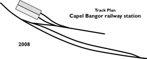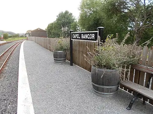 The village community at Capel Bangor was once much larger than it is today, and in the earliest days of the Vale of Rheidol Railway Capel Bangor was the third principal station along with the two termini. It had a resident Station Master, and was equipped with waiting shelters, booking office, passing loop, sidings, and a large carriage shed.[2] These facilities were all removed with the gradual decline of the village population, although in the 1980s British Rail, then the operators of this line, rebuilt a stone waiting shelter, and provided a picnic area for passengers alighting from trains here.