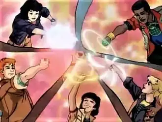 The Planeteers. Clockwise from top left: Gi, Kwame, Linka, Ma-Ti, and Wheeler.