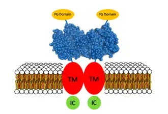 One face of the dimer contains proteoglycan (PG) domains-a feature that is unique from other CA enzymes- and the opposite face contains the C-termini which help the enzyme attach to the cell membrane.[15] CA IX contains an N-linked glycosylation site bearing mannose-type glycan structures on Asn-309 as well as an O-linked glycosylation site on Thr-78.[16]