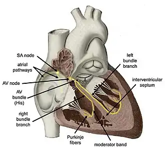 The cardiac conduction system (CCS, also called the electrical conduction system of the heart)[1] transmits the signals generated by the sinoatrial node – the heart's pacemaker, to cause the heart muscle to contract, and pump blood through the body's circulatory system. The pacemaking signal travels through the right atrium to the atrioventricular node, along the bundle of His, and through the bundle branches to Purkinje fibers in the walls of the ventricles. The Purkinje fibers transmit the signals more rapidly to stimulate contraction of the ventricles.[2]