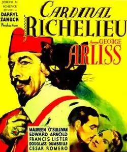 Cardinal Richelieu is a 1935 American historical film directed by Rowland V. Lee and starring George Arliss, Maureen O'Sullivan, Edward Arnold and Cesar Romero.[1] It was based on the 1839 play Richelieu by Edward Bulwer-Lytton depicting the life of the great seventeenth century French statesman Cardinal Richelieu and his dealings with Louis XIII.