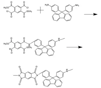 Polyimides are polymers made up of imide group is incorporated into the monomers, with the imide existing in the backbone of the chain. These can be synthesized by either a one-step route or a two-step route. The two-step route involves first reacting the diamine monomer with an acid chloride or carboxylic acid to form a polygamic acid. Heating the polygamic acid then results in cyclodehydration, forming the imide. Alternatively, the synthesis can be carried out in one step in which chain grown and ring closure happen simultaneously. This reaction occurs at high temperatures in organic solvents including cresol, nitrobenzene, benzonitrile, and sulfolane.[1] The diamide is dissolved, and then dianhydrides are added to the solution before the temperature is raised.[8] The reaction is raised to temperatures within the range of 100-200 degrees Celsius and quenched with methanol.[7][8] This one step synthesis produces higher molecular weight polymer chains than the two step synthesis and is now the preferred method.[1][7][8]
